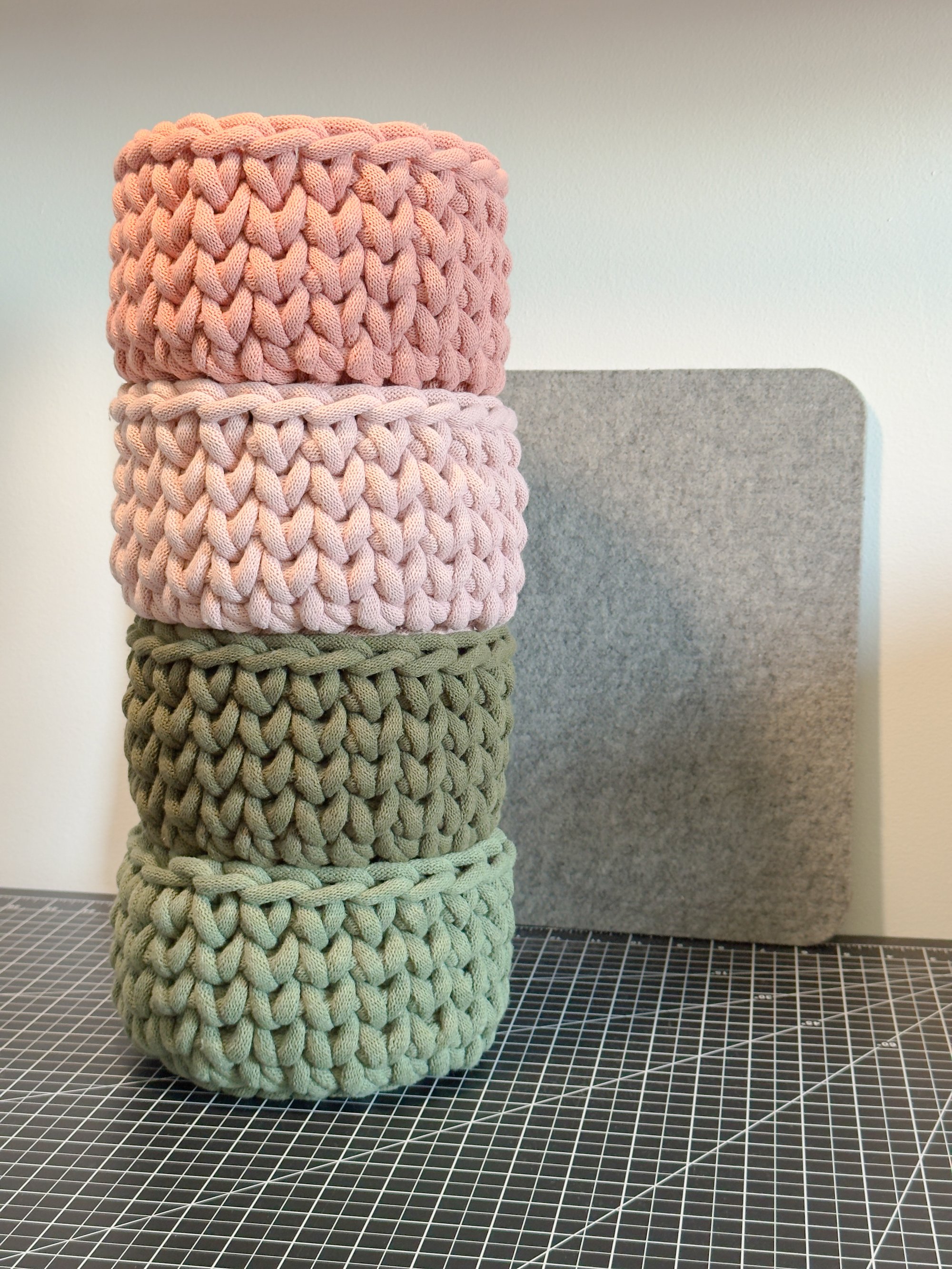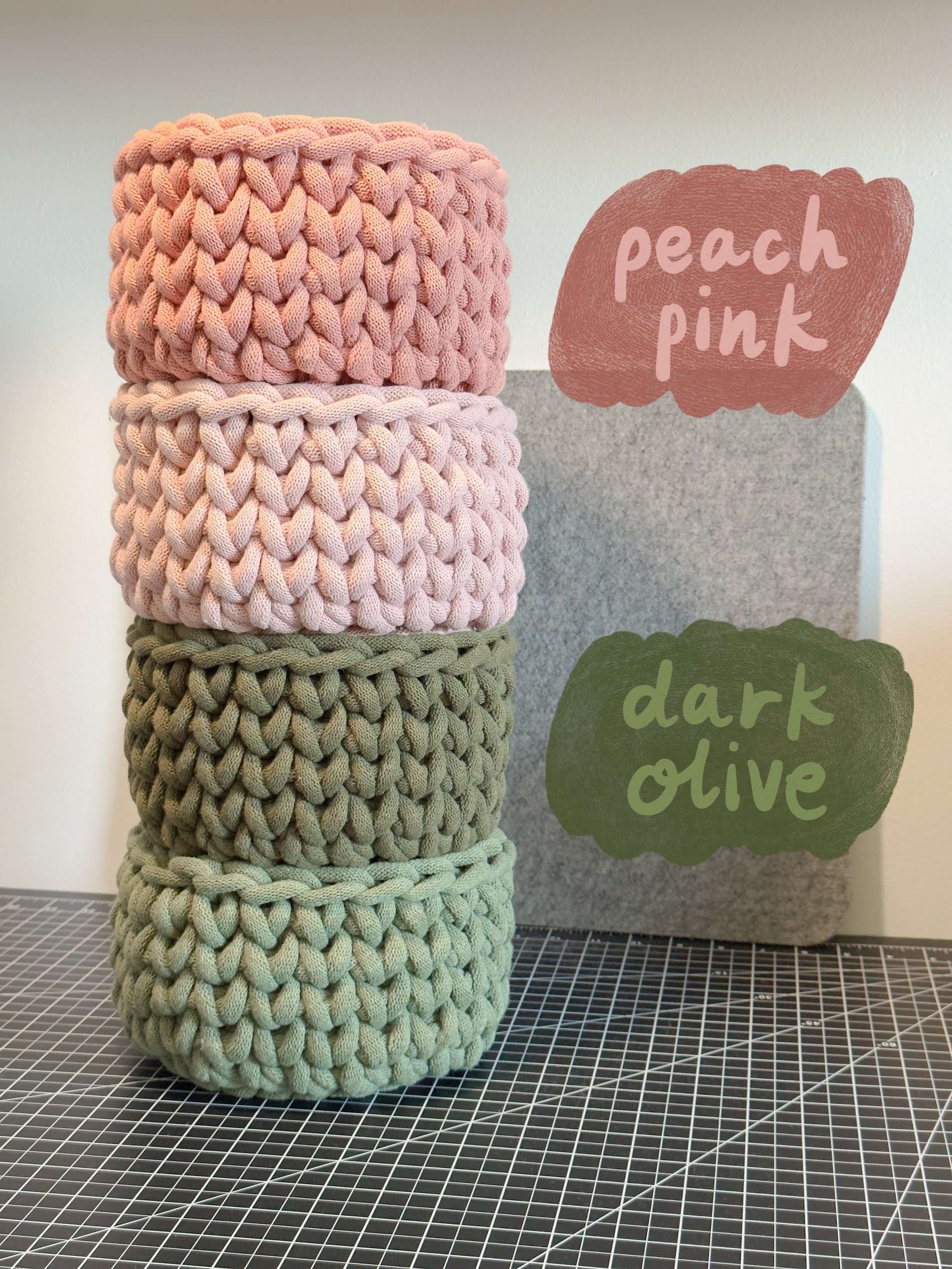 handmade crochet basket, made sustainably by hand from a 100% recycled cotton cord, featuring a plush polyester filling. it has a nice, tactile squish while still being very sturdy. available in a variety of colors. listing is for one basket.